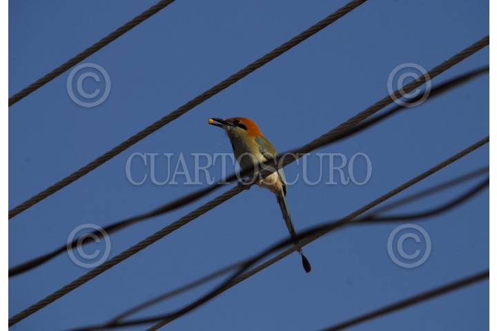 CHILPANCINGO, GUERRERO, 17ENERO2018.- Ave posa en los cables; mientras en el pico sostiene una fruta con la que se alimenta. FOTO: JOSÉ I. HERNÁNDEZ /CUARTOSCURO.COM
