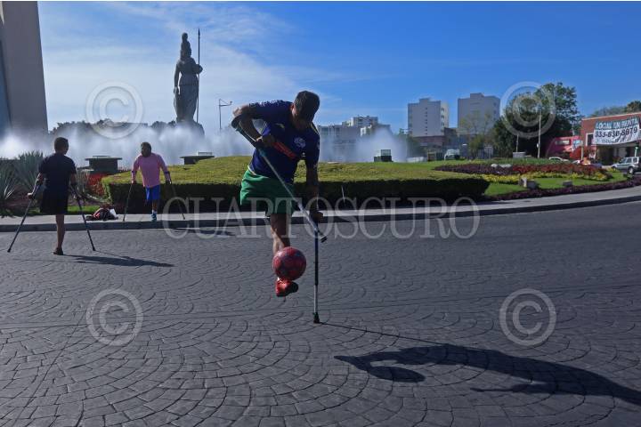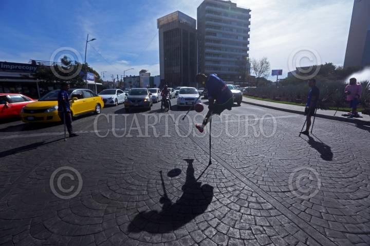 Roger domina la pelota ante la mirada de los automovilistas y de sus compañeros que esperan su turno para participar.