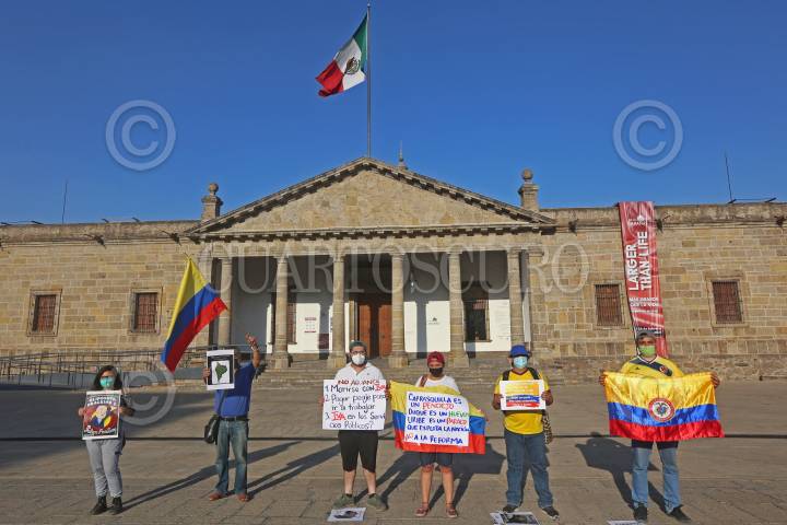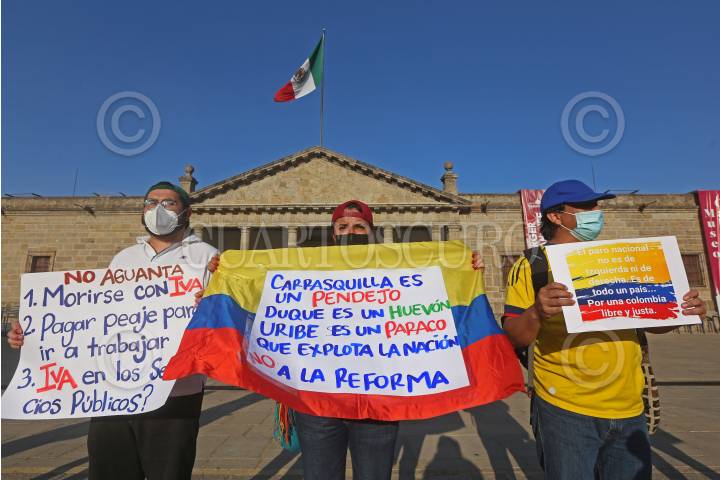 Colombianos residentes en Jalisco protestaron esta tarde para sumarse al paro nacional en Colombia por la reforma tributaria propuesta por Iván Duque Márquez.