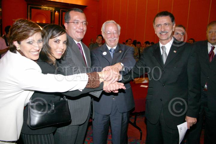 MEXICO, DF, 13DICIEMBRE2005.- Laura Elena Herrejón integrante del movimiento Pro-Vecino, María de los Ángeles Fromow, Fiscal Especializada en Prevención y Atención a Delitos Electorales (FEPADE), Carlos Ugalde, consejero presidente del IFE, Alberto Núñez Secretario General de la COPARMEX y Carlos Abascal Secretario de Gobernación al termino de la ceremonia donde se firmo el compromiso con la civilidad democrática celebrado en un hotel de Polanco. FOTO: Leonardo Casas/CUARTOSCURO.COM