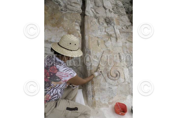 VALLE DE EDZNA, CAMPECHE, 28JUNIO2012.- Mascarón este ante los trabajos de restauraciñon. FOTO: DIANA ARANO /INAH /CUARTOSCURO.COM