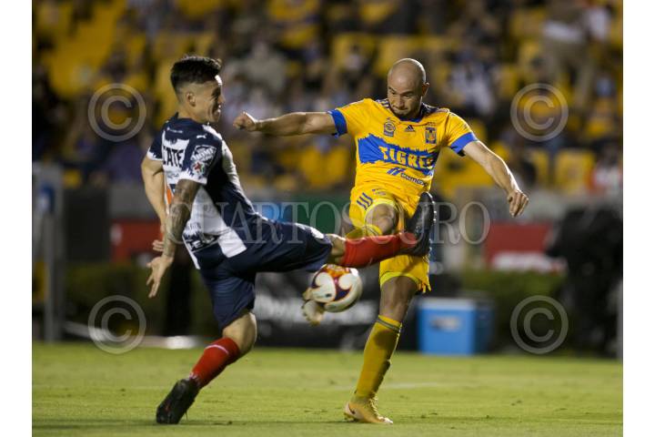 Carlos González del equipo de los Tigres de la UANL, se disputa el balón con Matías Kranevitter de los Rayados del Monterrey, en el estadio Universitario, partido correspondiente a la jornada 16 de la Liga Mx, Clausura Guardianes 2021. Marcador Final: Tigres: 2 - Monterrey: 1