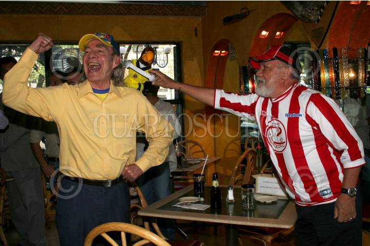 MÉXICO, D.F., 22MARZO2007.- Manuel "El loco" Valdés cobró a Sergio Corona la apuesta que realizaron por el más reciente clásico del futbol mexicano, América-Chivas. FOTO: ISAAC ESQUIVEL/CUARTOSURO.COM
