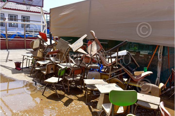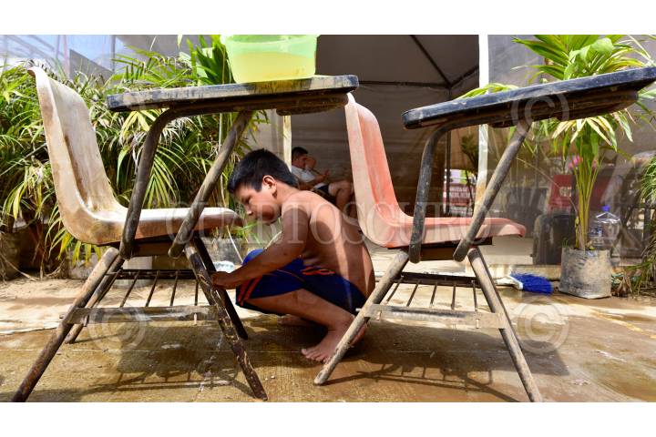 ACAPULCO, GUERRERO, 14OCTUBRE2024.- Por segunda vez en menos de un año la primaria Alfonso García Robles de la colonia Alborada quedó inundada. Las pasadas lluvias del huracán John inundaron hasta casi 2 metros las aulas improvisadas en donde niños toman clases. La primaria apenas había iniciado su proceso de reconstrucción por los daños que sufrió el huracán Otis cuando volvió a sufrir los embates de la naturaleza. El día de hoy estudiantes y autoridades se dieron a la tarea de hacer labores de limpieza. Autoridades de educación mencionaron que el 80% las escuelas de Guerrero estarán en condiciones de volver a clases en esta semana. FOTO: CARLOS ALBERTO CARBAJAL/CUARTOSCURO.COM