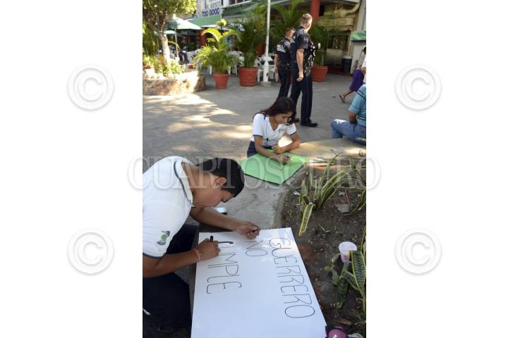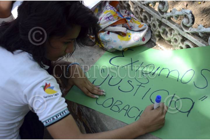 ACAPULCO, GUERRERO, 11ABRIL2013.- Alumnos y maestros del Cobach 7 regresaron a clases en el zócalo de Acapulco el pasado miércoles, donde además efectuaron una protesta para exigir seguridad a las autoridades. Profesores consultados manifestaron que no hay condiciones para impartir clases en la colonia Santa Cecilia, donde se ubica el Cobach 7 e insistieron en ser reubicados. Aproximadamente mil alumnos del Cobach 7 toman clases en la Unidad Deportiva Acapulco (UDA) de la colonia Progreso, debido al secuestro y posterior asesinato de un profesor y una alumna del plantel, cuyos cuerpos fueron localizados en una vereda del cerro del Veladero el pasado 8 de marzo, tras una semana de estar desaparecidos. FOTO: BERNANDINO HERNÁNDEZ /CUARTOSCURO.COM