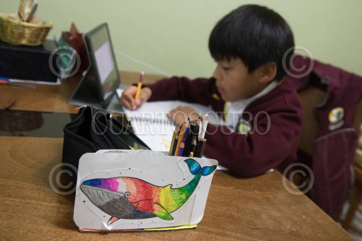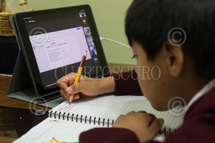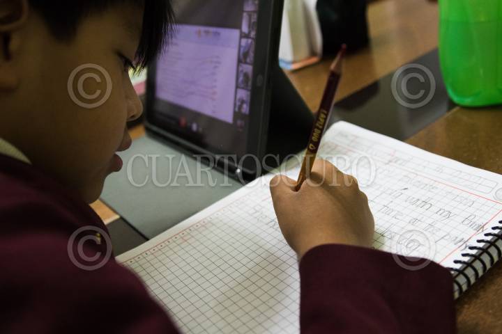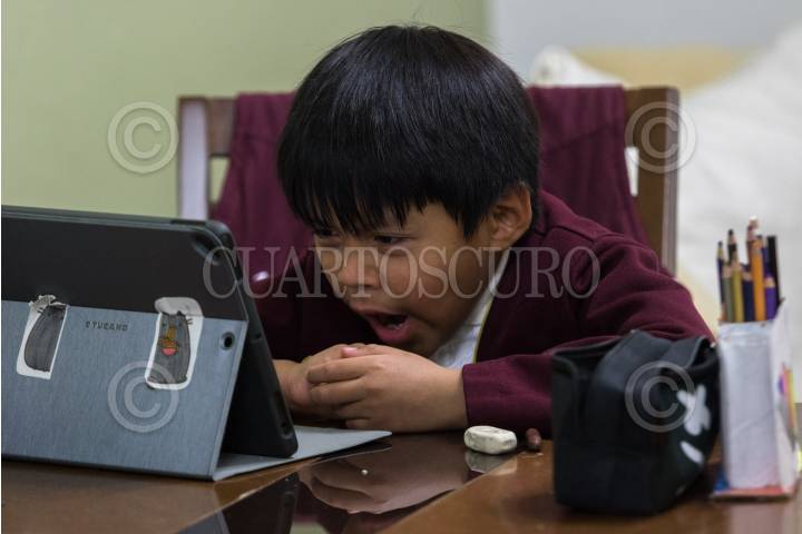 Un niño de educación básica toma clases virtuales.