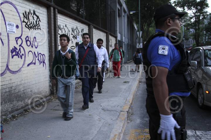 MÉXICO, D.F., 13ABRIL2015.- Mas de un millón 700 mil alumnos de educación preescolar, primaria y secundaria, regresan a clases por lo que la Secretaría de Seguridad Pública del Distrito Federal (SSPDF), aplicará un dispositivo de seguridad y tránsito en las inmediaciones de las escuelas. El operativo iniciará a partir de las 06:00 horas y participarán 12 mil 555 elementos de distintos agrupamientos, apoyados por mil 195 vehículos terrestres, así como dos helicópteros que sobrevolarán la ciudad. FOTO: ISABEL MATEOS /CUARTOSCURO.COM