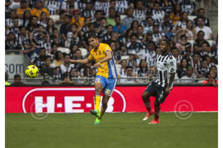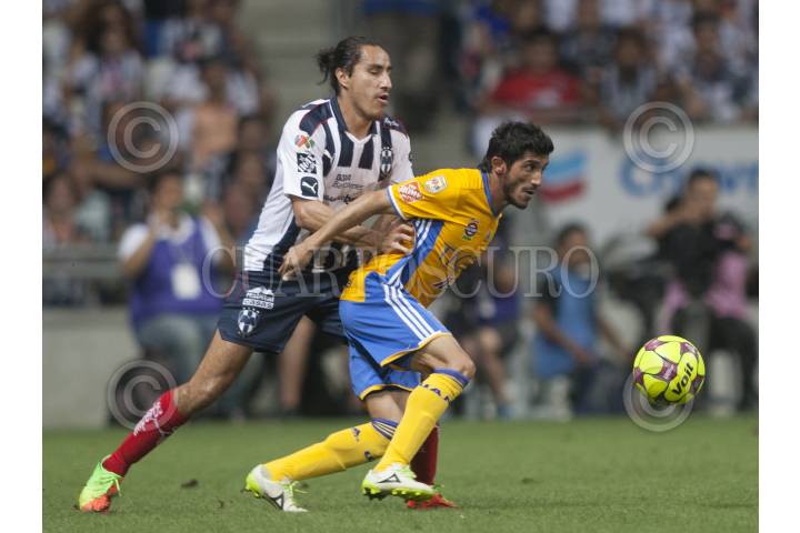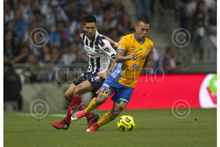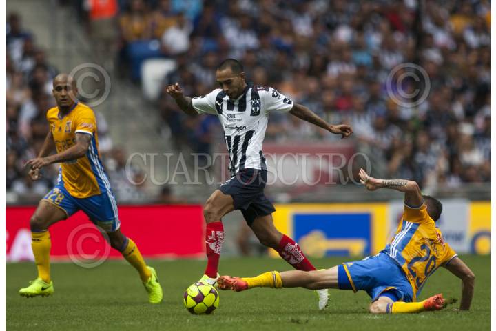 MONTERREY, NUEVO LEÓN, 22ABRIL2017.- Celso Ortíz del equipo de los Rayados del Monterrey se disputa el balón con Jesús Vargas del equipo de los Tigres de la UANL en el estadio BBVA Bancomer, en el Clásico Regio 110, partido correspondiente a la jornada 15 de la Liga MX, Clausura 2017. Marcador Final: Monterrey: 1 - Tigres: 0 FOTO: GABRIELA PÉREZ MONTIEL /CUARTOSCURO.COM
