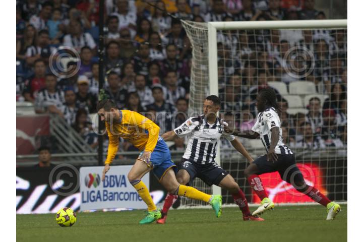 MONTERREY, NUEVO LEÓN, 22ABRIL2017.- Luis Fuentes del equipo de los Rayados del Monterrey se disputa el balón con André Pierre Gignac del equipo de los Tigres de la UANL en el estadio BBVA Bancomer, en el Clásico Regio 110, partido correspondiente a la jornada 15 de la Liga MX, Clausura 2017. Marcador Final: Monterrey: 1 - Tigres: 0 FOTO: GABRIELA PÉREZ MONTIEL /CUARTOSCURO.COM