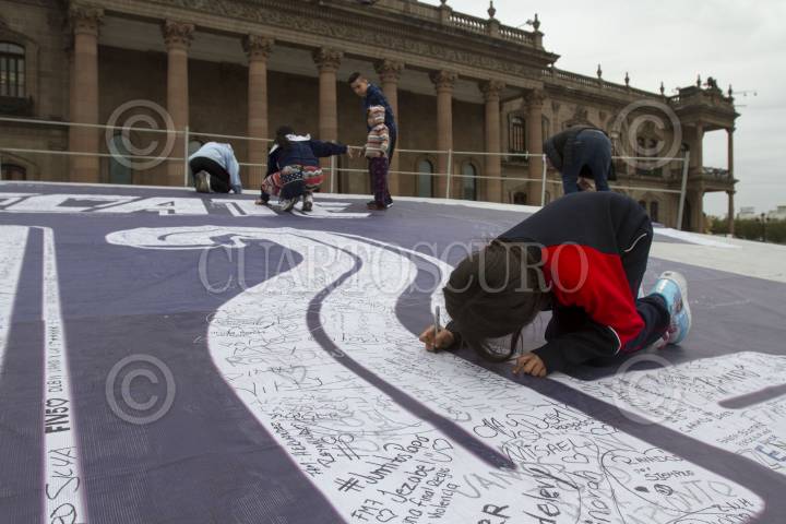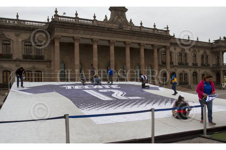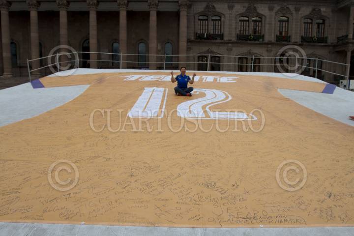 MONTERREY, NUEVO LEÓN, 06DICIEMBRE2017.- Colocan en la Explanada de los Héroes mega playeras de los equipos de futbol Tigres y Rayados para llamar a la afición a la convivencia pacífica. Los aficionados pueden escribir en las camisas palabras alusivas a fomentar la paz en los partidos de la final de la Liga MX. FOTO: GABRIELA PÉREZ MONTIEL /CUARTOSCURO.COM