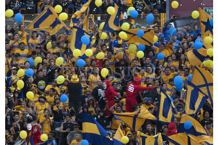 MONTERREY, NUEVO LEÓN, 28ABRIL2018.- Aficionados del equipo de los Tigres de la UANL, cantan en las gradas, durante el “Clásico Regio” 116, partido correspondiente a la jornada 17 de la Liga MX, Clausura 2018. Marcador Final: Tigres: 2 - Monterrey: 2 FOTO: GABRIELA PÉREZ MONTIEL /CUARTOSCURO.COM