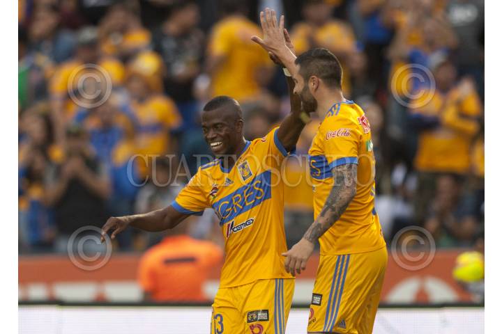 MONTERREY, NUEVO LEÓN, 28ABRIL2018.- Enner Valencia y André-Pierre Gignac del equipo de los Tigres de la UANL, celebran el gol, ante el equipo de los Rayados del Monterrey, en el estadio Universitario, durante el “Clásico Regio” 116, partido correspondiente a la jornada 17 de la Liga MX, Clausura 2018. Marcador Final: Tigres: 2 - Monterrey: 2 FOTO: GABRIELA PÉREZ MONTIEL /CUARTOSCURO.COM