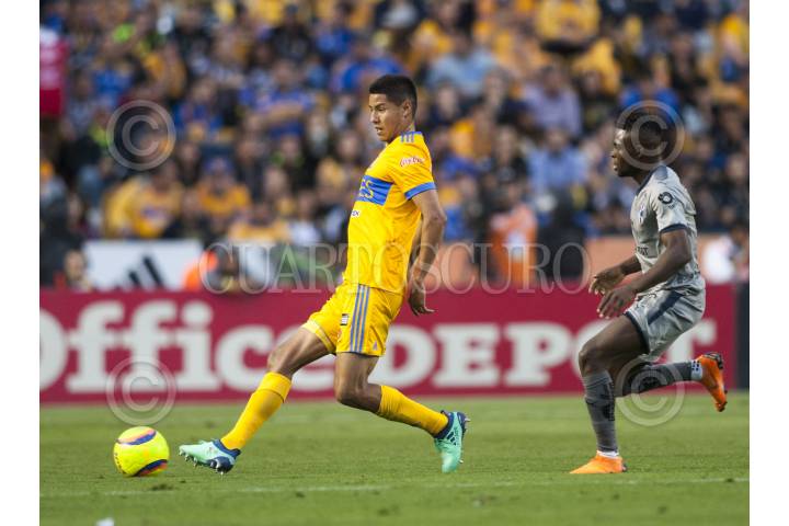 Luis Rodríguez del equipo de los Tigres de la UANL, se disputa el balón con Vincent Janssen de los Rayados del Monterrey, en el estadio Universitario, partido correspondiente a la jornada 16 de la Liga Mx, Clausura Guardianes 2021. Marcador Final: Tigres: 2 - Monterrey: 1