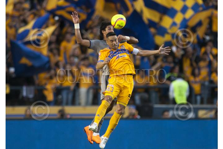 MONTERREY, NUEVO LEÓN, 22ABRIL2017.- Edgar Castillo del equipo de los Rayados del Monterrey se disputa el balón con Jesús Dueñas del equipo de los Tigres de la UANL en el estadio BBVA Bancomer, en el Clásico Regio 110, partido correspondiente a la jornada 15 de la Liga MX, Clausura 2017. Marcador Final: Monterrey: 1 - Tigres: 0 FOTO: GABRIELA PÉREZ MONTIEL /CUARTOSCURO.COM