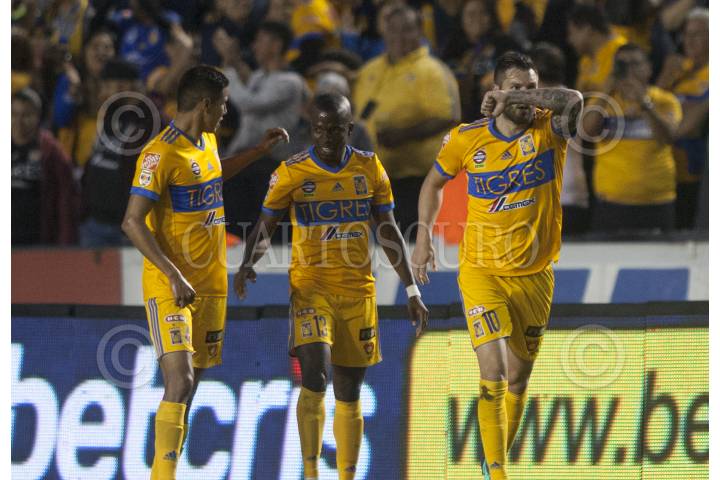 MONTERREY, NUEVO LEÓN, 28ABRIL2018.- Jugadores del equipo de los Tigres de la UANL, celebran el gol, ante el equipo de los Rayados del Monterrey, en el estadio Universitario, durante el “Clásico Regio” 116, partido correspondiente a la jornada 17 de la Liga MX, Clausura 2018. Marcador Final: Tigres: 2 - Monterrey: 2 FOTO: GABRIELA PÉREZ MONTIEL /CUARTOSCURO.COM