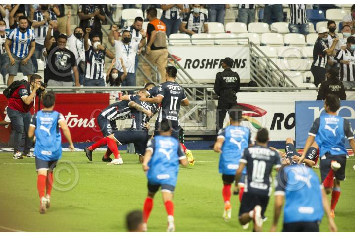 Jugadores del equipo de los Rayados del Monterrey, celebran el gol ante los Tigres de la UANL, en el estadio BBVA Bancomer, en el Clásico Regio 126, partido correspondiente a la jornada 9, de la Liga Mx, Apertura 2021. Marcador Final: Monterrey: 2 - Tigres: 0