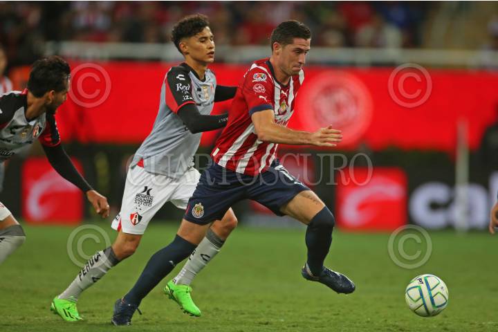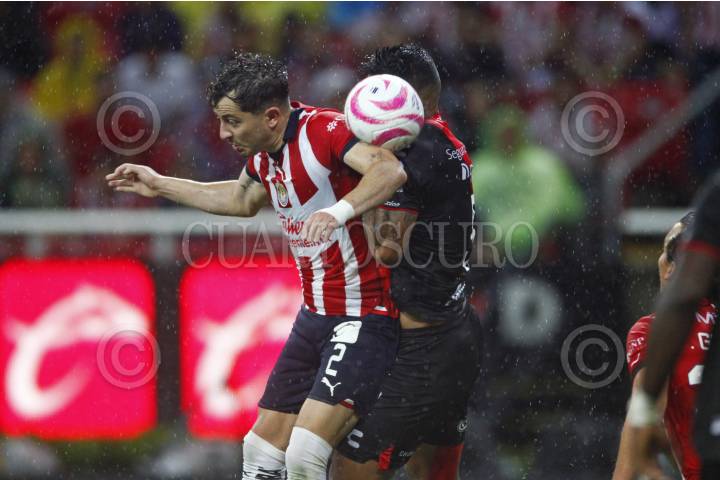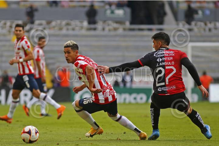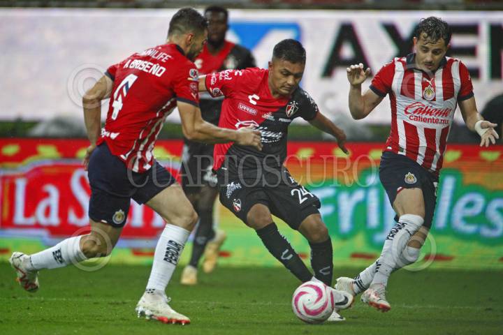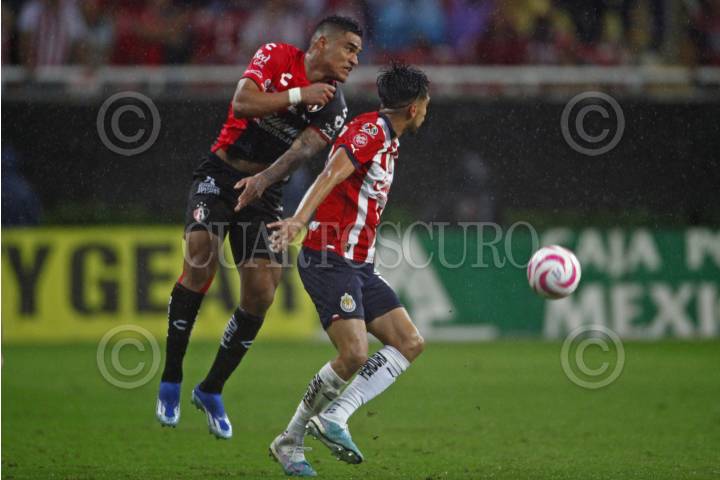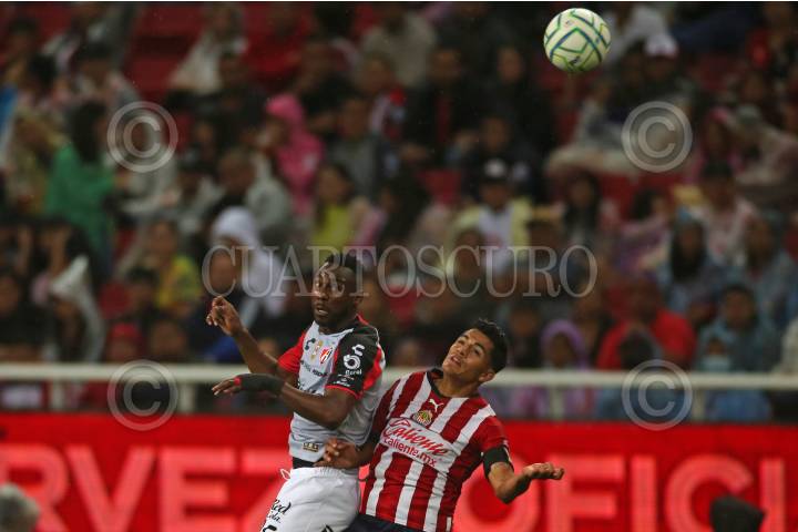 Julián Quiñonez, jugador de Atlas, disputa un balón con el contrario de Chivas, Jesús Sánchez, esto en partido correspondiente a la Jornada 8 del Torneo Apertura 2022 de la Liga BBVA MX.