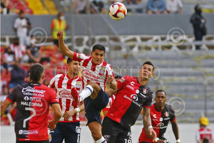 Jesús Sánchez Jugador de Chivas, disputa un balón ante el contrario de Atlas Milton Caraglio, esto durante el juego correspondiente a la fecha 16 del Torneo Guardianes Clausura 2021que se lleva a cabo en el Estadio Jalisco.