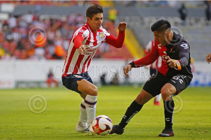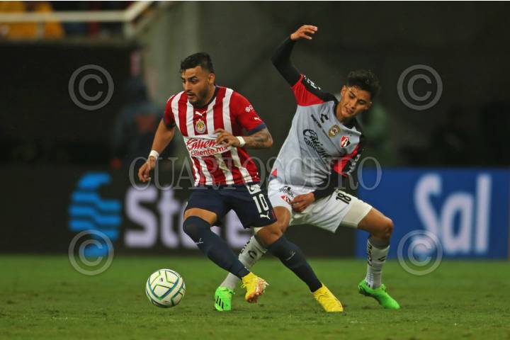 Alexis Vega, jugador de Chivas, disputa un balón con el contrario de Atlas, Ángel Márquez, esto en partido correspondiente a la Jornada 8 del Torneo Apertura 2022 de la Liga BBVA MX.