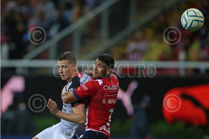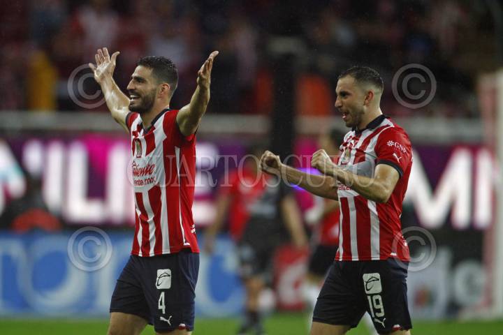 Gilberto Sepúlveda, jugador de Chivas, disputa un balón con el contrario de Atlas, Julio Furch, esto en partido correspondiente a la Jornada 8 del Torneo Apertura 2022 de la Liga BBVA MX.