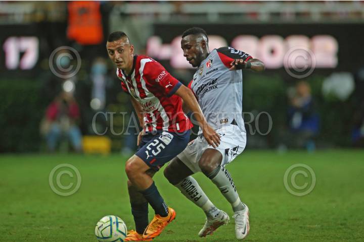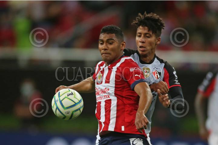 Roberto Alvarado, jugador de Chivas, disputa un balón con el contrario de Atlas, Julián Quiñonez, esto en partido correspondiente a la Jornada 8 del Torneo Apertura 2022 de la Liga BBVA MX.