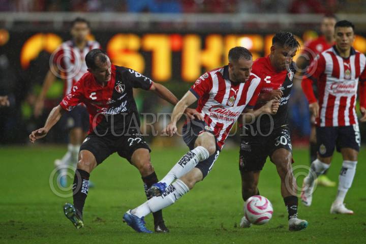 ZAPOPAN, JALISCO, 07OCTUBREE2023.-Cristopher Trejo jugador de Atlas disputa el balón con los contrarios de Chivas, Alan Mozo y Antonio Briseño, esto en partido correspondiente a la jornada 12 del Torneo Apertura Temporada 2023-2024 de la Liga MX, en donde se enfrentan los equipos de Chivas vs Atlas en el Clásico Tapatío que se lleva a cabo en el Estadio Akron, el marcador al final es de 4-1, a favor del equipo local. FOTO: FERNANDO CARRANZA GARCIA / CUARTOSCURO.COM