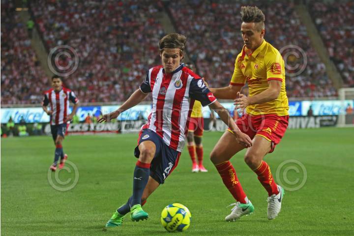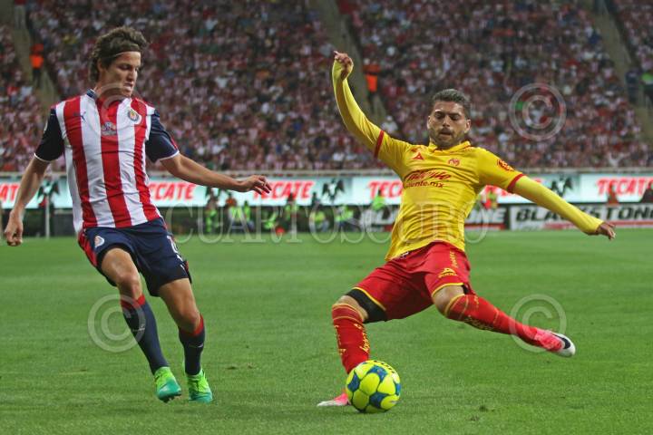 ZAPOPAN, JALISCO. 19ABRIL2017.- Carlos Fierro, jugador de Chivas disputa un balón a Gerardo Rodríguez de Monarcas, en partido correspondiente a la Final de la Copa MX, del Torneo Clausura 2017, en donde se enfrentan las Chivas de Guadalajara frente a Monarcas Morelia, en partido que se lleva a cabo en el Estadio Chivas. FOTO : FERNANDO CARRANZA GARCIA / CUARTOSCURO.COM