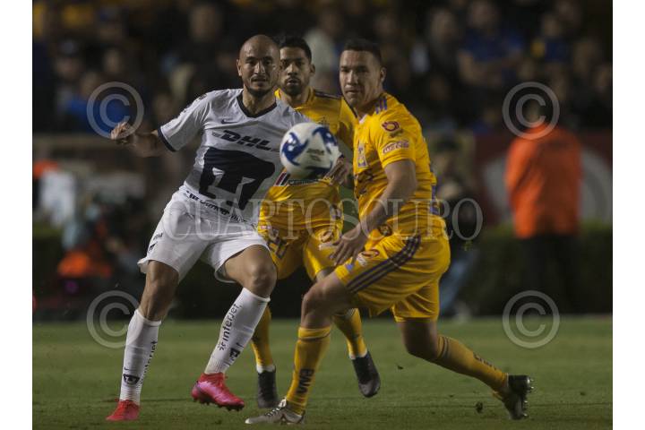 MONTERREY, NUEVO LEÓN, 29FEBRERO2020- Jesús Dueñas del equipo de los Tigres de la UANL, se disputa el balón con Carlos González del equipo de los Pumas de la UNAM, en el estadio Universitario, partido correspondiente a la jornada 8 de la Liga MX, Clausura 2020. Marcador Final: Tigres: 3 - Pumas: 0 FOTO: GABRIELA PÉREZ MONTIEL /CUARTOSCURO.COM