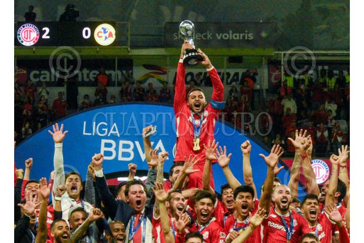 TOLUCA, ESTADO DE MÉXICO, 25MAYO2025.- Alexis Vega jugador de Los Diablos de Toluca sostiene el trofeo con el que se coronan como campeones de la Final del Torneo Clausura 2025 de la Liga BBVA MX, disputada ante las Águilas del América, el encuentro culminó con un marcador 2-0, marcador global 2-0. FOTO: CRISANTA ESPINOSA AGUILAR/ CUARTOSCURO.COM