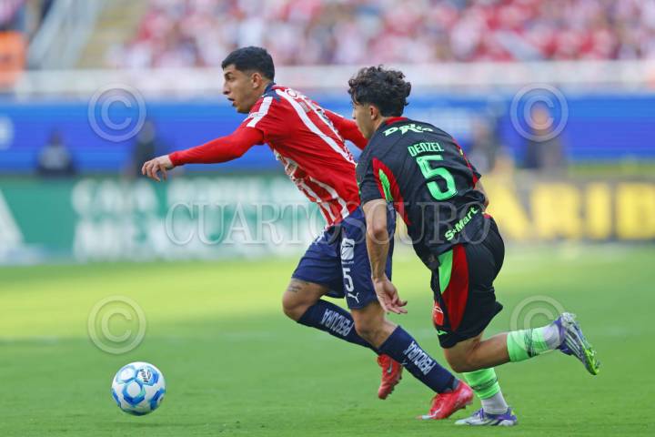 ZAPOPAN, JALISCO, 16AGOSTO2025.- Diego Campillo jugador de Chivas disputa el balón con el contrario de Juárez Rodolfo Pizarro, esto en partido correspondiente jornada 5 del Torneo Apertura 2025 de la Liga MX, en donde se enfrentan los equipos de Chivas vs Juárez y en juego que se lleva a cabo en el Estadio Akron, el marcador al momento es de 2-0 a favor del equipo visitante. FOTO: FERNANDO CARRANZA GARCIA / CUARTOSCURO.COM