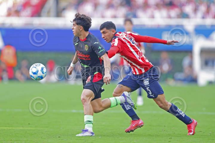 ZAPOPAN, JALISCO, 16AGOSTO2025.- Bryan González jugador de Chivas disputa el balón con el contrario de Juárez Denzel García, esto en partido correspondiente jornada 5 del Torneo Apertura 2025 de la Liga MX, en donde se enfrentan los equipos de Chivas vs Juárez y en juego que se lleva a cabo en el Estadio Akron, el marcador al momento es de 2-0 a favor del equipo visitante. FOTO: FERNANDO CARRANZA GARCIA / CUARTOSCURO.COM