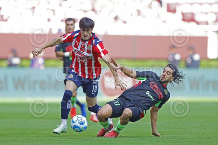 ZAPOPAN, JALISCO, 16AGOSTO2025.- Erick Gutiérrez jugador de Chivas disputa el balón con el contrario de Juárez José Rodríguez, esto en partido correspondiente jornada 5 del Torneo Apertura 2025 de la Liga MX, en donde se enfrentan los equipos de Chivas vs Juárez y en juego que se lleva a cabo en el Estadio Akron, el marcador al momento es de 2-0 a favor del equipo visitante. FOTO: FERNANDO CARRANZA GARCIA / CUARTOSCURO.COM