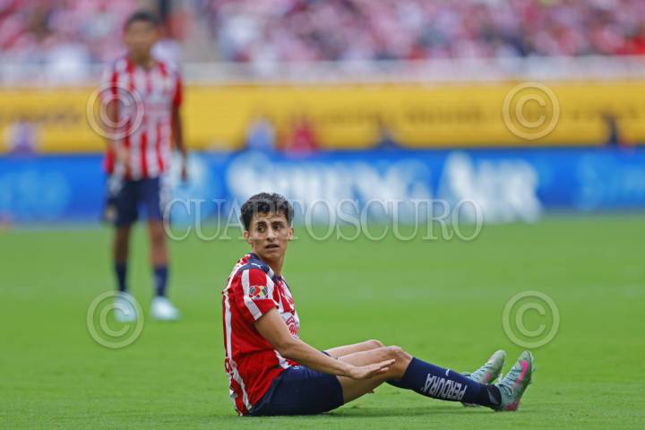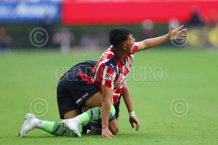 ZAPOPAN, JALISCO, 16AGOSTO2025.- Jugador de Chivas se queja de una falta, esto en partido correspondiente jornada 5 del Torneo Apertura 2025 de la Liga MX, en donde se enfrentan los equipos de Chivas vs Juárez y en juego que se lleva a cabo en el Estadio Akron, el marcador al final es de 2-1 a favor del equipo visitante. FOTO: FERNANDO CARRANZA GARCIA / CUARTOSCURO.COM