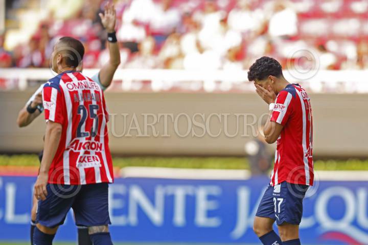 ZAPOPAN, JALISCO, 16AGOSTO2025.- Jugadores de Chivas se lamentan por la derrota, esto en partido correspondiente jornada 5 del Torneo Apertura 2025 de la Liga MX, en donde se enfrentan los equipos de Chivas vs Juárez y en juego que se lleva a cabo en el Estadio Akron, el marcador al final es de 2-1 a favor del equipo visitante. FOTO: FERNANDO CARRANZA GARCIA / CUARTOSCURO.COM