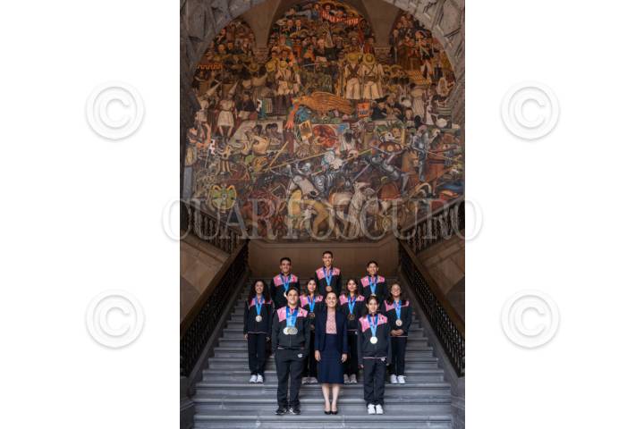 CIUDAD DE MÉXICO, 05AGOSTO2025.- Claudia Sheinbaum Pardo, Presidenta de México, se toma foto con los.medallitas del Campeonato del Mundo de Deportes Acuáticos realizado en Singapur, en donde destacó la actuación de Osmar Olvera. La foto se dio en las escaleras del Palacio Nacional. FOTO: PRESIDENCIA/CUARTOSCURO.COM
