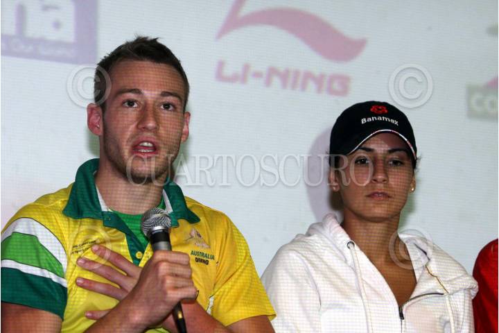 BOCA DEL RIO, VERACRUZ, 15ABRIL2010.- Los clavadistas, Mathew Mitcham, Paola Espinosa, Wu Minxia y Tomas Daley, ofrecieron una conferencia ante los medios de comunicación previo a su participación dentro de la serie mundial de clavados FINA/Li-NIng 2010, a celebrarse los días 16 y 17 del presente en el centro acuático leyes de reforma de esta ciudad. FOTO: JOSE CANDELARIO/CUARTOSCURO.COM