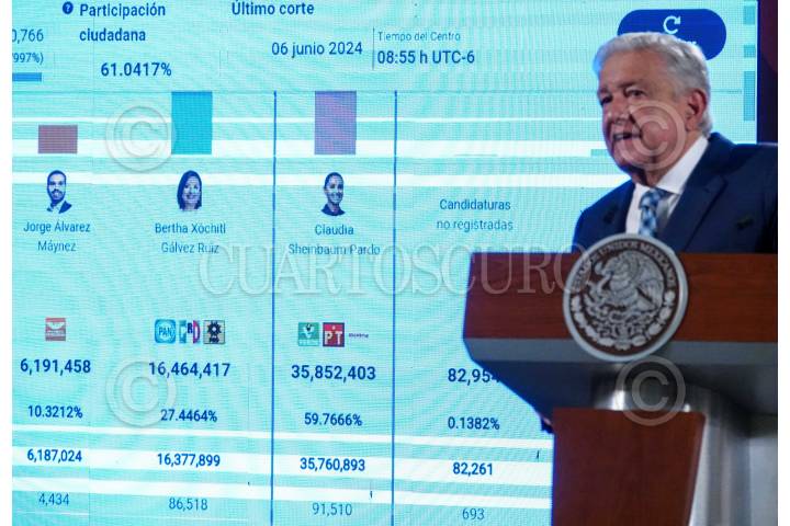 CIUDAD DE MÉXICO, 06JUNIO2024.- Andrés Manuel López Obrador, presidente de México, muestra la actualización del conteo de boletas de las elecciones presidenciales, durante la conferencia de prensa matutina. FOTO: GALO CAÑAS/CUARTOSCURO.COM