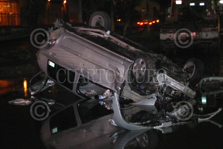 MÉXICO, D.F., 18AGOSTO2008.- En la calzada Ignacio Zaragoza y la calle de Tito Ferrer de la colonia Santa Martha Acatitla, un automovil renault-clio de color gris-plata, volco al salir de un charco de agua. El saldo una persona muerta de nombre Jesús Pacheco de 25 años de edad. FOTO: LUZ ACEVEDO/CUARTOSCURO.COM