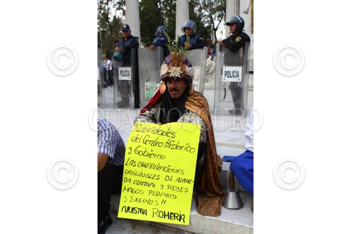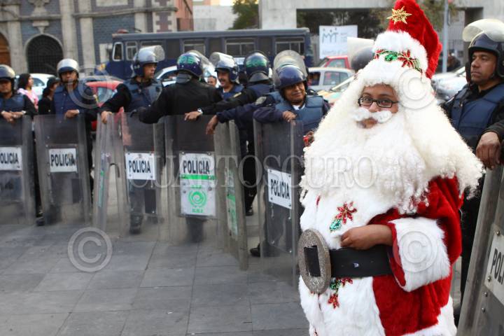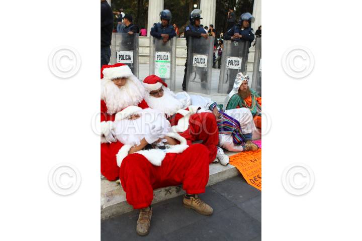 MÉXICO, D.F., 18DICIEMBRE2010.- Comerciantes que cada año se disfrazan de santa clos y reyes magos se manifestaron en el Hemiciclo a Juárez por que esta temporada aún el gobierno capitalino no les ha asignado un lugar para que se trabajen. Es toda una tradición para los defeños acudir a la Alameda Central y tomarse la foto con estos personajes navideños, sin embargo, todo indica que este 2010 no se contará con esta festividad. Apenas el día de ayer se colocó una feria sobre avenida Hidalgo lugar que en épocas pasadas se utilizó para esta actividad. Los manifestantes fueron encapsulados por granaderos, aunque muchos niños aprovecharon para saludarlos. FOTO: MOISÉS PABLO/CUARTOSCURO.COM