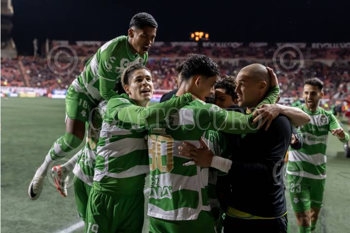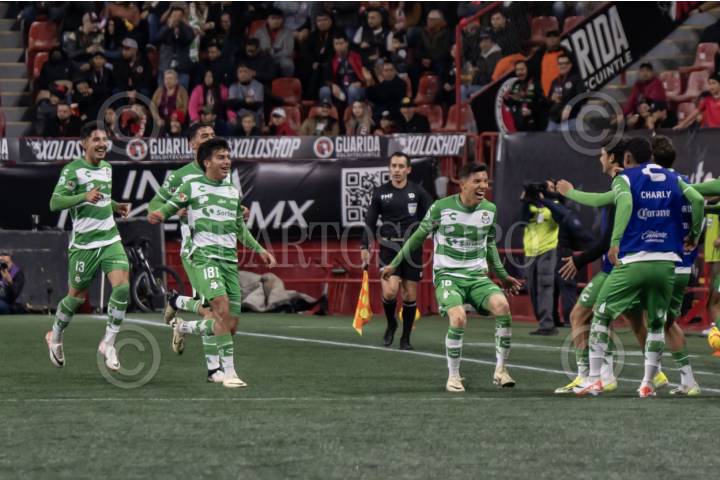 TIJUANA BAJA CALIFORNIA, 15MARZO2024.- Xolos siguen sin ganar en el torneo de Clausura de la Liga Mx al empatar 2-2 contra Santos Laguna en partido correspondiente a la Jornada 12 realizado en el estadio Caliente. En la imagen el festejo del equipo visitante tras anotar el gol del empate. FOTO: OMAR MARTÍNEZ/CUARTOSCURO.COM