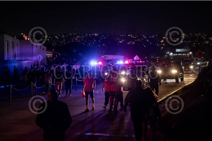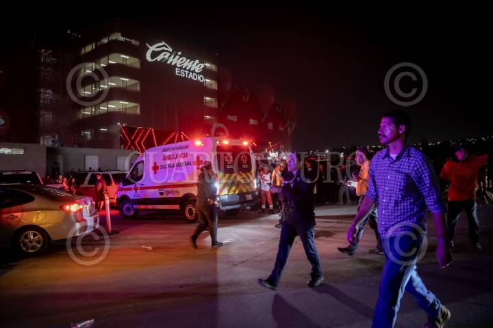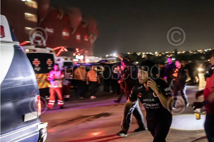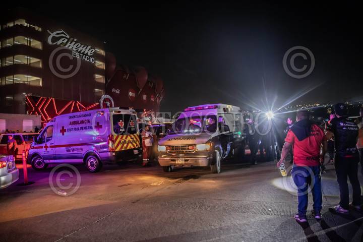 TIJUANA BAJA CALIFORNIA, 12JULIO2024.- Un ataque armado se registró en el estacionamiento del estadio Caliente la noche del viernes 12 de julio durante el partido Xolos vs Chivas. Minutos después de haber finalizado el juego, donde la jauría se llevó la victoria, un hombre fue lesionado por disparos de arma de fuego, al salir al estacionamiento por el acceso tres, alrededor de las 22:35 horas. De acuerdo a información extraoficial, la víctima había tenido una riña a golpes con otro sujeto durante el partido y al salir fue atacado a balazos, recibiendo un disparo en el cuello. Paramédicos de la Cruz Roja llegaron al lugar para trasladar a la víctima, de aproximadamente 25 años de edad, quien llevaba un pantalón blanco y la camisa del equipo de Tijuana en estado grave. FOTO: OMAR MARTÍNEZ/CUARTOSCURO.COM
