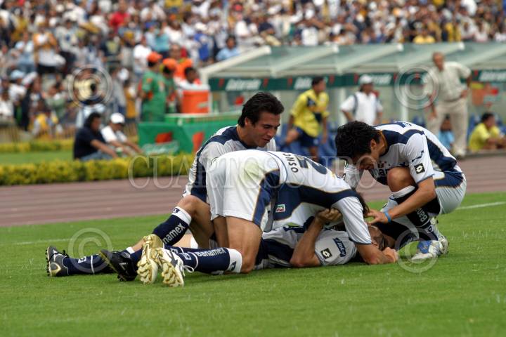 MEXICO, D.F. 10ABRIL2005.- Festejo de Bruno Marioni por el gol que los hizo ganar en su encuentro con el Puebla en el juego de la fecha 12 del Campeonato Clausura 2005 en el estadio Olímpico. FOTO: Sandra Perdomo/CUARTOSCURO.COM