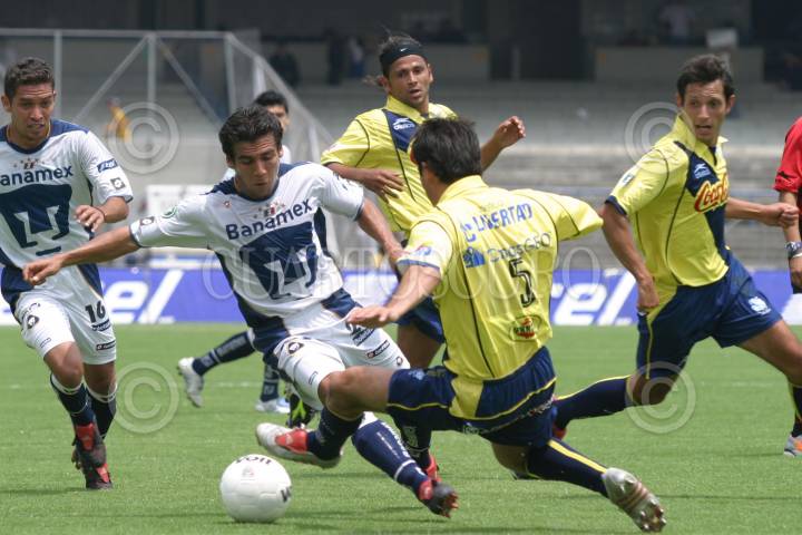 MEXICO, D.F. 10ABRIL2005.- Ismael Iñiguez, de los Pumasde la Universidad y Adrian Sánchez, del Puebla se diputan el balón en el juego de la fecha 12 del Campeonato Clausura 2005 en el estadio Olímpico. FOTO: Sandra Perdomo/CUARTOSCURO.COM