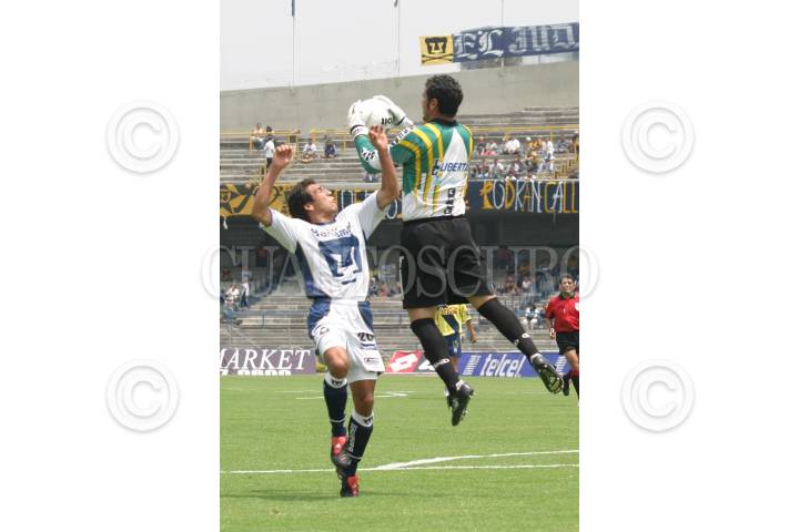 MEXICO, D.F. 10ABRIL2005.- Ismael Íñiguez, de los Pumasde la Universidad y Oscar Dautt, portero del Puebla durante el juego de la fecha 12 del Campeonato Clausura 2005 en el estadio Olímpico. FOTO: Sandra Perdomo/CUARTOSCURO.COM