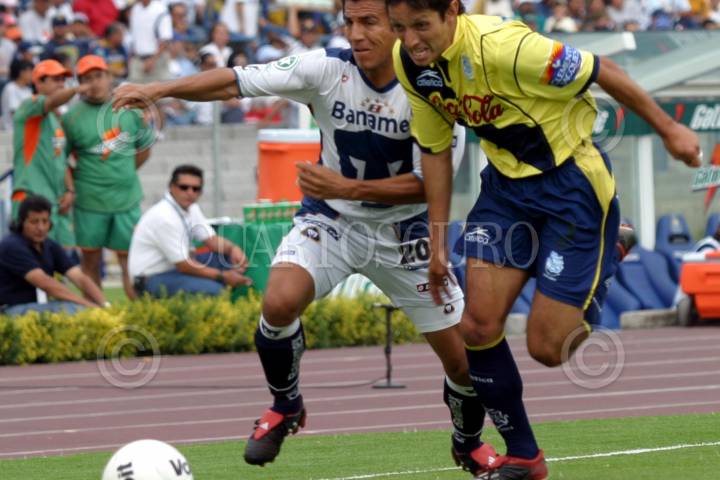 MEXICO, D.F. 10ABRIL2005.- Diego Alonso, de los Pumas de la Universidad se disputa el balón con un jugador del Puebla, en el juego de la fecha 12 del Campeonato Clausura 2005 en el estadio Olímpico. FOTO: Sandra Perdomo/CUARTOSCURO.COM