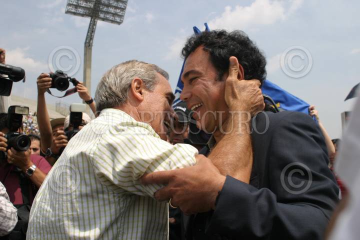 MEXICO, D.F. 10ABRIL2005.- Los directores técnicos del Puebla y de los Pumas de la UNAM, Roberto Saporiti y Hugo Sánchez, respectivamente antes de iniciar el juego de la fecha 12 del Campeonato Clausura 2005 en el estadio Olímpico. FOTO: Sandra Perdomo/CUARTOSCURO.COM