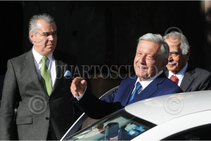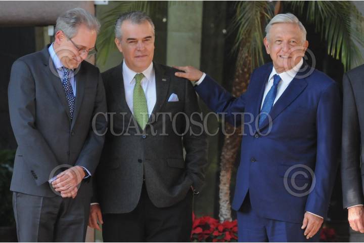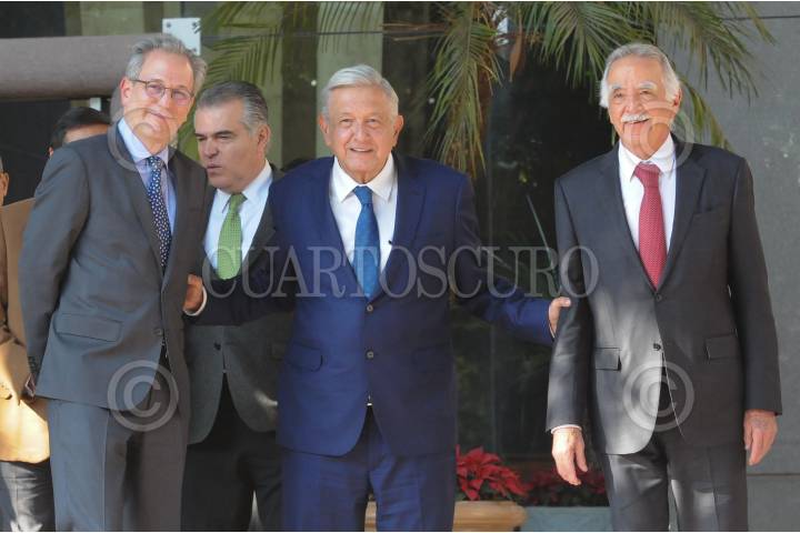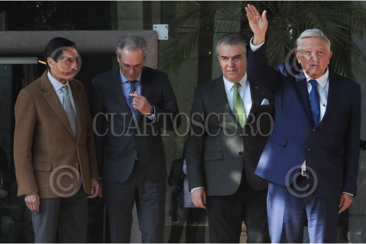 Andrés Manuel López Obrador, presidente de México sale de la reunión con empresarios acompañado de Antonio del Valle y Francisco Cervantes.