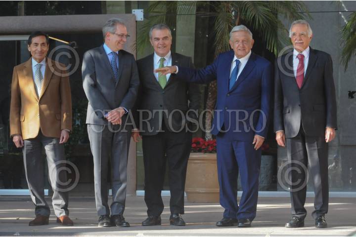 Antonio del Valle Perochena, Rolando Vega Saenz, Rogelio Ramírez de la O., Secretario de Hacienda, Francisco Cervantes Díaz y Andrés Manuel López Obrador salen de la reunión entre empresarios y el presidente en el museo Kaluz