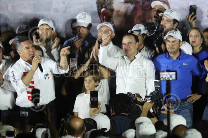 Manolo Jiménez, candidato a la gubernatura de Coahuila por el PRI-PAN-PRD, festejo su virtual triunfo en las elecciones del día de hoy. Lo acompañaron Jesús Zambrano, Alejandro Moreno Cárdenas y Matko Cortés. FOTO: