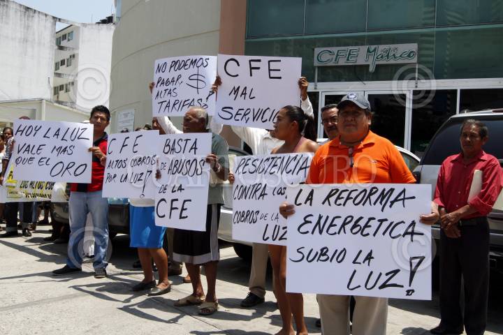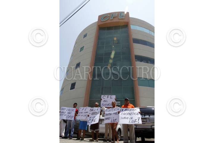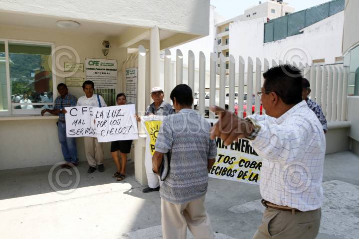 ACAPULCO, GUERRERO, 15ABRIL2014.- Unos cincuenta perredistas marcharon y se manifestaron en las afueras de las oficinas divisionales de la Comisión Federal de Electricidad (CFE) en la colonia Costa Azul, para protestar por los altos cobros a los usuarios de la colonia Bella Vista entre otras. Exigieron que la paraestatal modifique los nuevos equipos instalados para medir el consumo, pues señalaron que provocan tarifas injustas y exageradas. Los manifestantes portaban cartulinas con mensajes como: "esto nos ocasiona la reforma energética"; "Ahora la luz vale más que el oro". El representante de la colonia Bella Vista, Juan salvador Reyes, señaló que en últimas fechas llegan los recibos de 3 mil 500 a 5 mil pesos, y hasta más caros. FOTO: BERNANDINO HERNÁNDEZ /CUARTOSCURO.COM